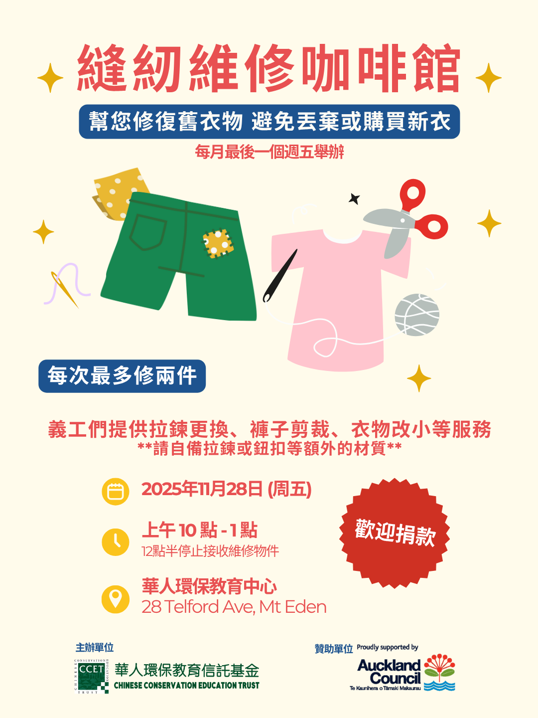 Help you repair old clothes to avoid throwing them away or buying new ones.Volunteers provide sewing repair service such as zipper replacement, pants alteration, and clothing tightening.**Please bring your own zippers and buttons.** Date: 28 Nov, 2025 (Friday) Time: 10:00 AM – 1:00 PM *Repairs close at 12:30 PM**Maximum two repairs Location: CCET Centre, 28…