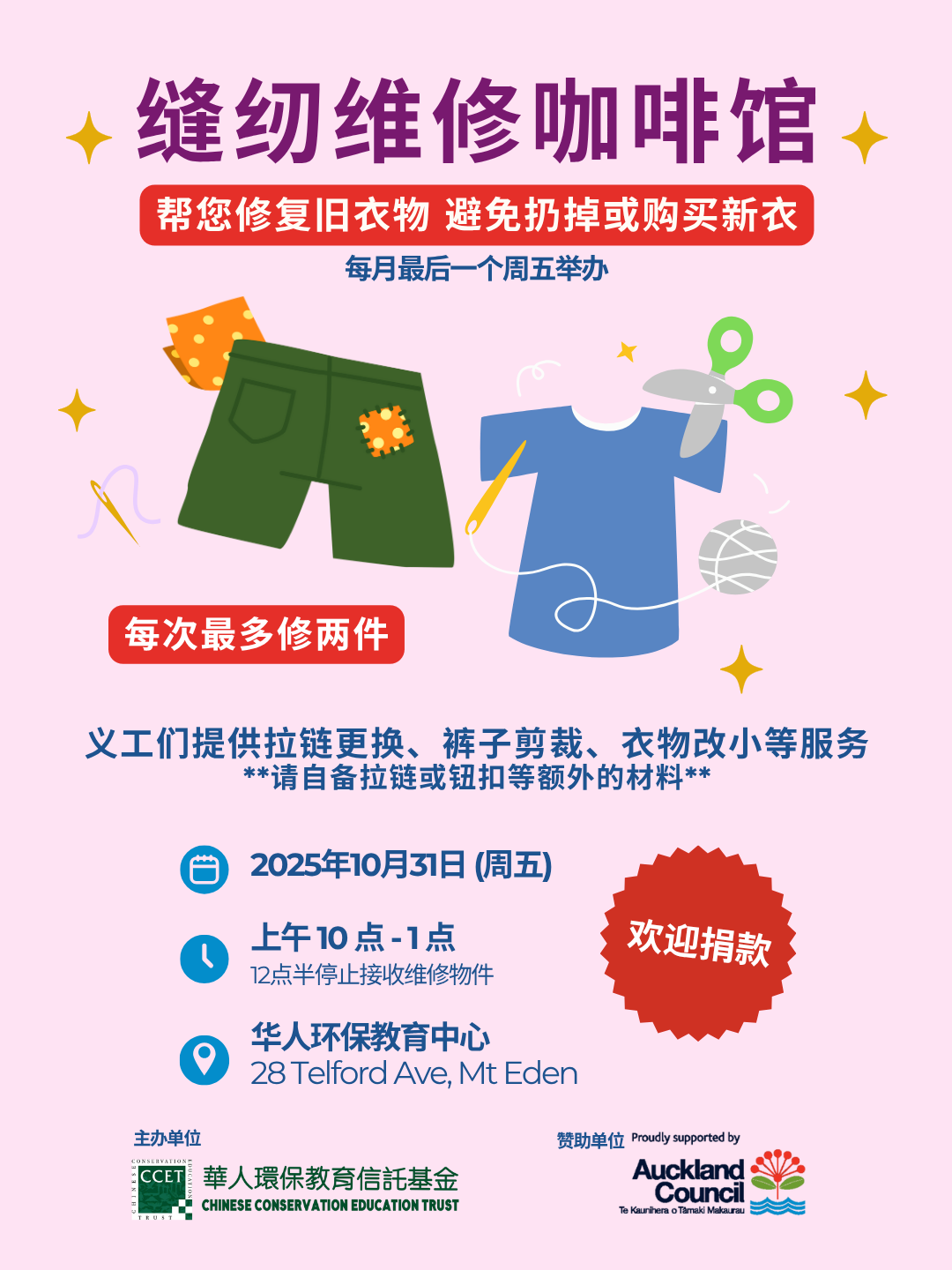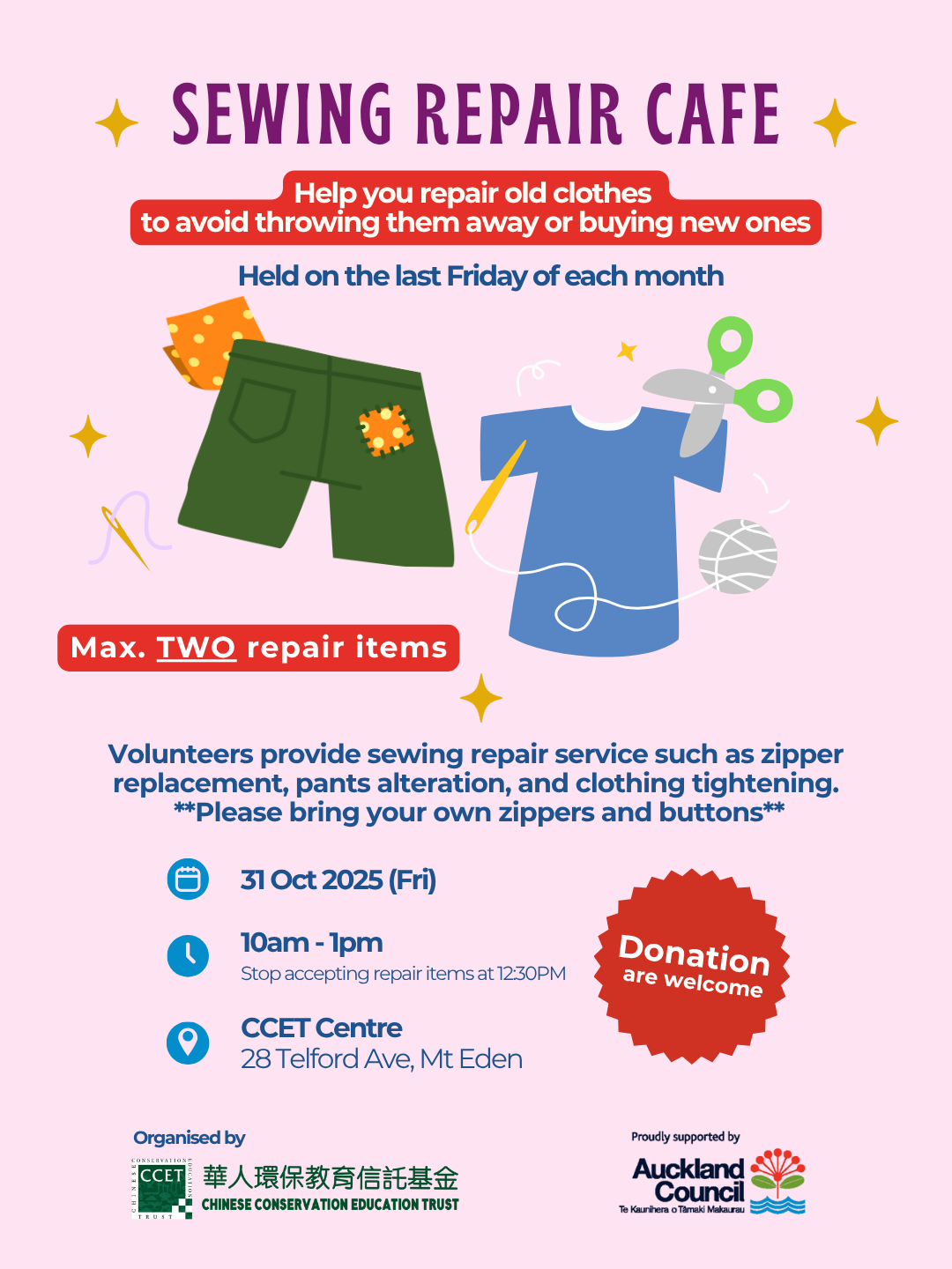 Volunteers provide sewing repair service such as zipper replacement, pants alteration, and clothing tightening.