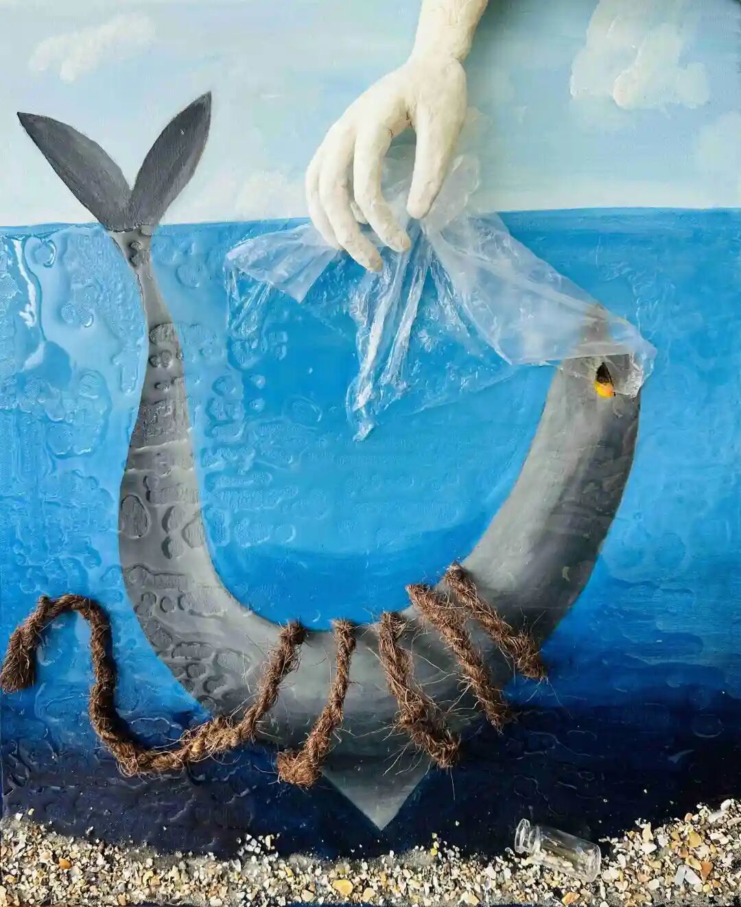 Description: If human hands choose to pick up trash, life will continue to grow and thrive. If human hands choose to discard trash, life will face destruction and extinction. Humans cannot survive alone on this planet; only by coexisting with all life can true sustainability be achieved. So, ask yourself now – when the choice is in your hands, how will you decide? Up or down? In this work, the artist cleverly uses various recyclable materials to enhance the expressiveness of the theme. For example: Plastic bags: used to represent litter carelessly discarded by humans, while directly interacting with dolphins (or whales) in the picture, highlighting the danger of marine life being entangled and ingested by plastic. Ropes: representing discarded fishing nets or synthetic fibers, tightly binding marine life, symbolizing the restrictions and damage that human activities inflict on the marine ecosystem. Broken glass or plastic fragments: appearing on the seabed as part of marine debris, emphasizing how human waste pollutes the ecological environment. These recyclable materials not only enhance the realism and impact of the artwork, but also convey a message: if we recycle and reuse them properly, these materials could have avoided ending up in the ocean and becoming life-threatening “killers.”