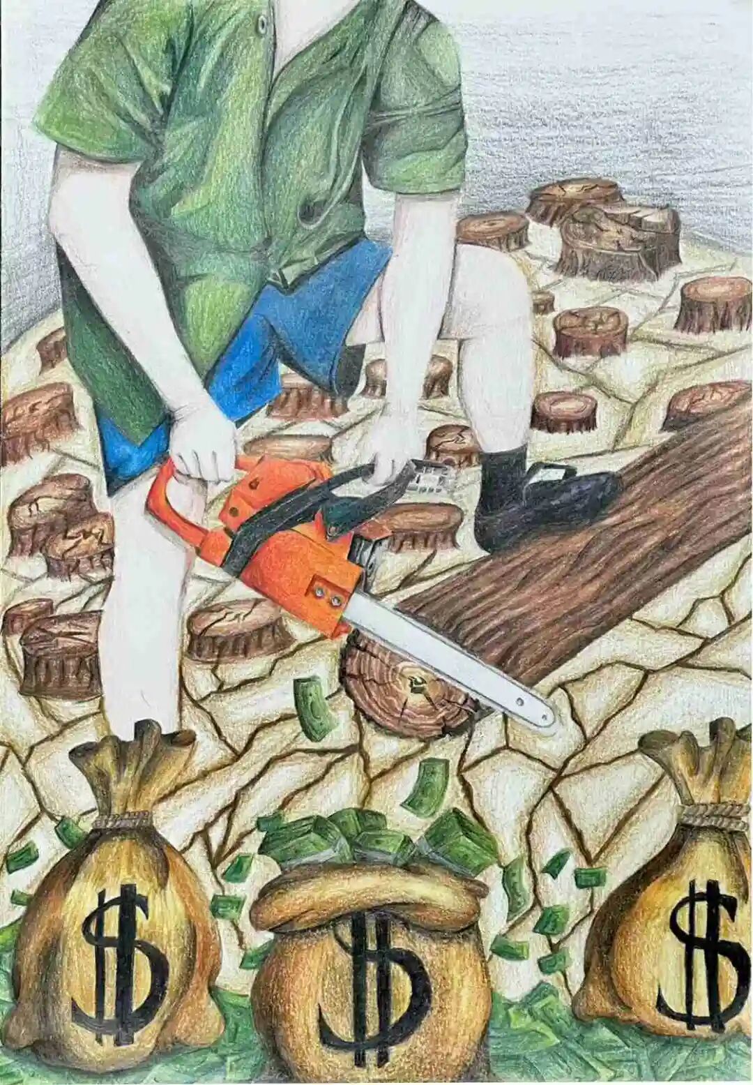 Description: A faceless figure—symbolizing all of humanity—is cutting down trees to exchange for money. However, deforestation quickly escalates into cutting down the entire planet. At his feet, a purse overflowing with cash symbolizes how short-term gains are driving long-term environmental destruction.