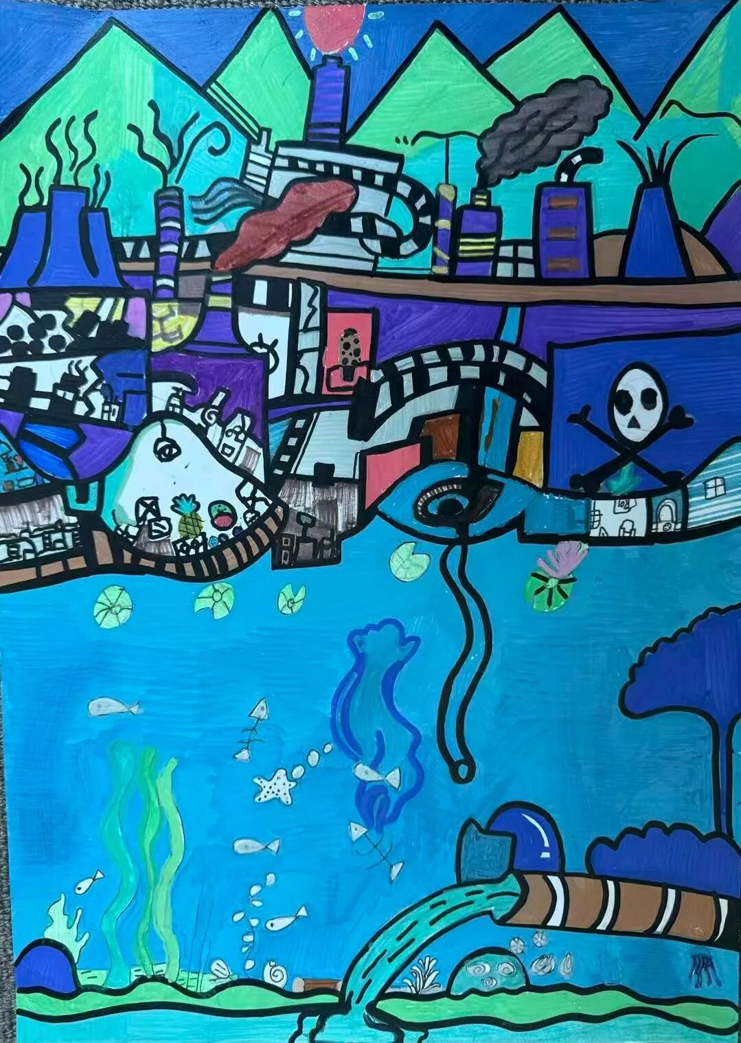 Description: In my painting, the ocean is crying. Dirty pipes discharge poison and smoke, and the fish are grieving, some have even disappeared. I dream that one day the ocean will smile again, and the fish will return to leap, play, and live happily.