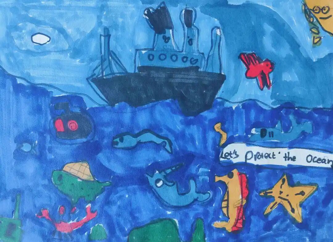 Description: I drew this picture because we must help the ocean! There’s a big ship and many fish in the picture. Some fish look happy, but some look sad because the water is polluted. There’s also a starfish, a crab, and even a seahorse in the picture! I hope to protect all the animals in the sea so they can live safely and happily. Let’s keep the ocean clean together!