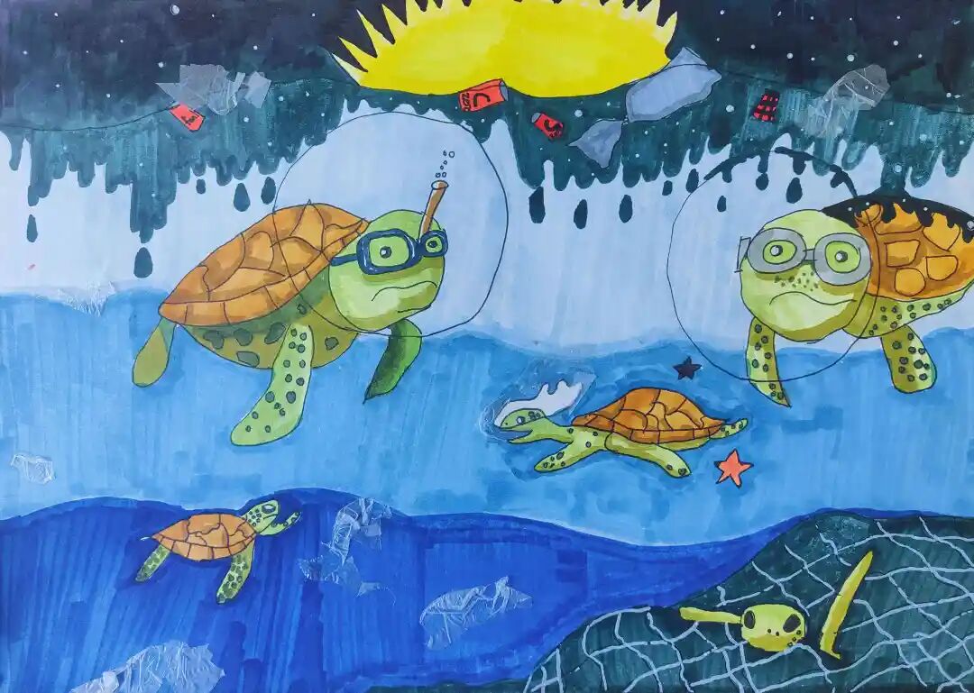 Description: In my painting, turtles are swimming with breathing tubes because the ocean is severely polluted by trash. Black stains drip from the sky, and cans, plastic, and other garbage float everywhere, even trapping baby turtles! I painted this to express how marine animals are suffering because of human-caused pollution. The turtles don’t look happy because we must clean up the ocean so they can swim freely in clean water again. We must help save the ocean and protect their future!