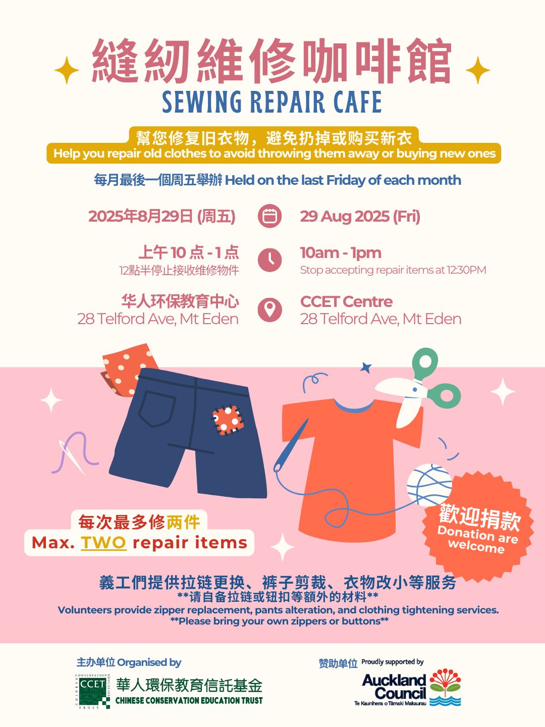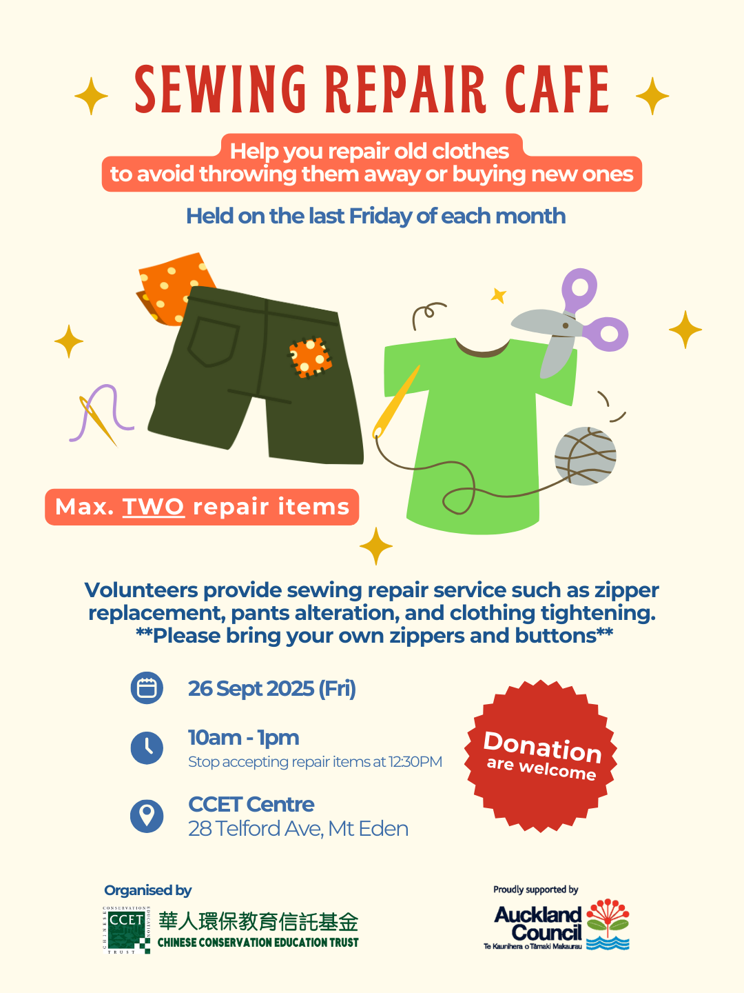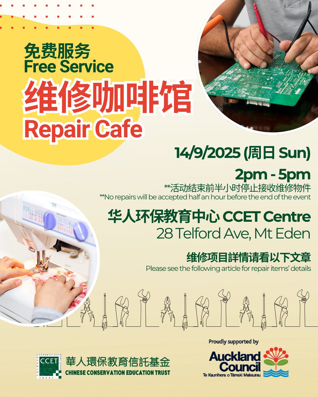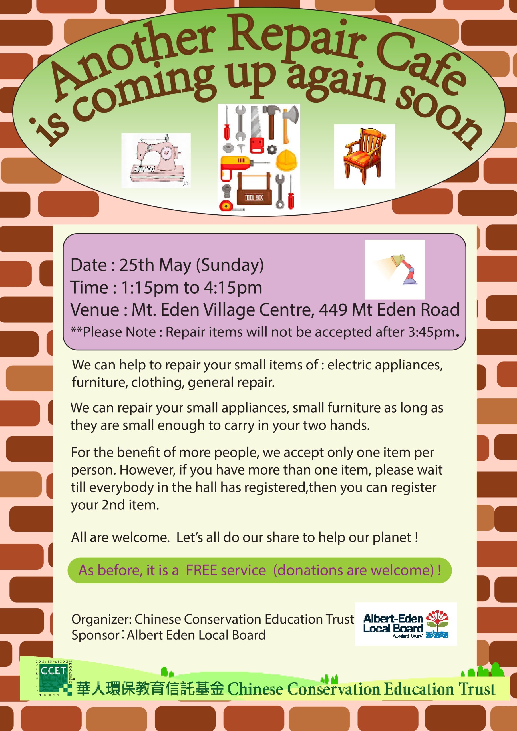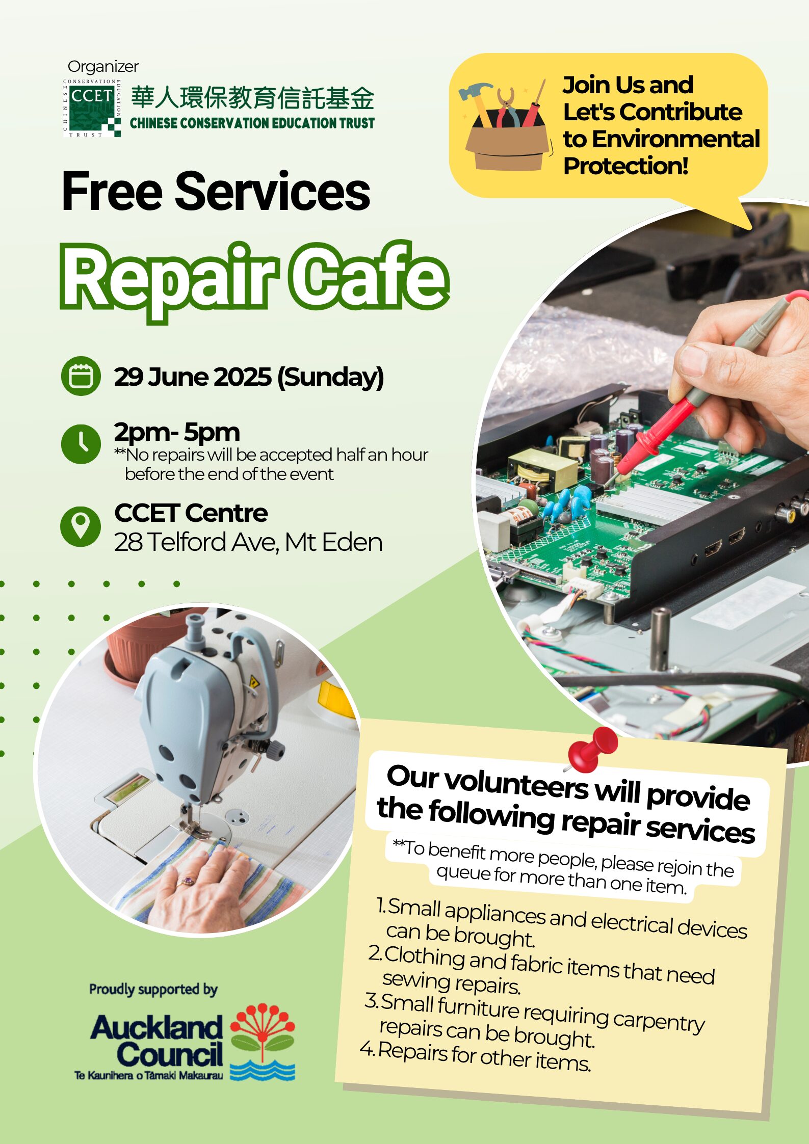 No repairs will be accepted half an hour before the end of the event CCET Centre 28 Telford Ave, Mt Eden