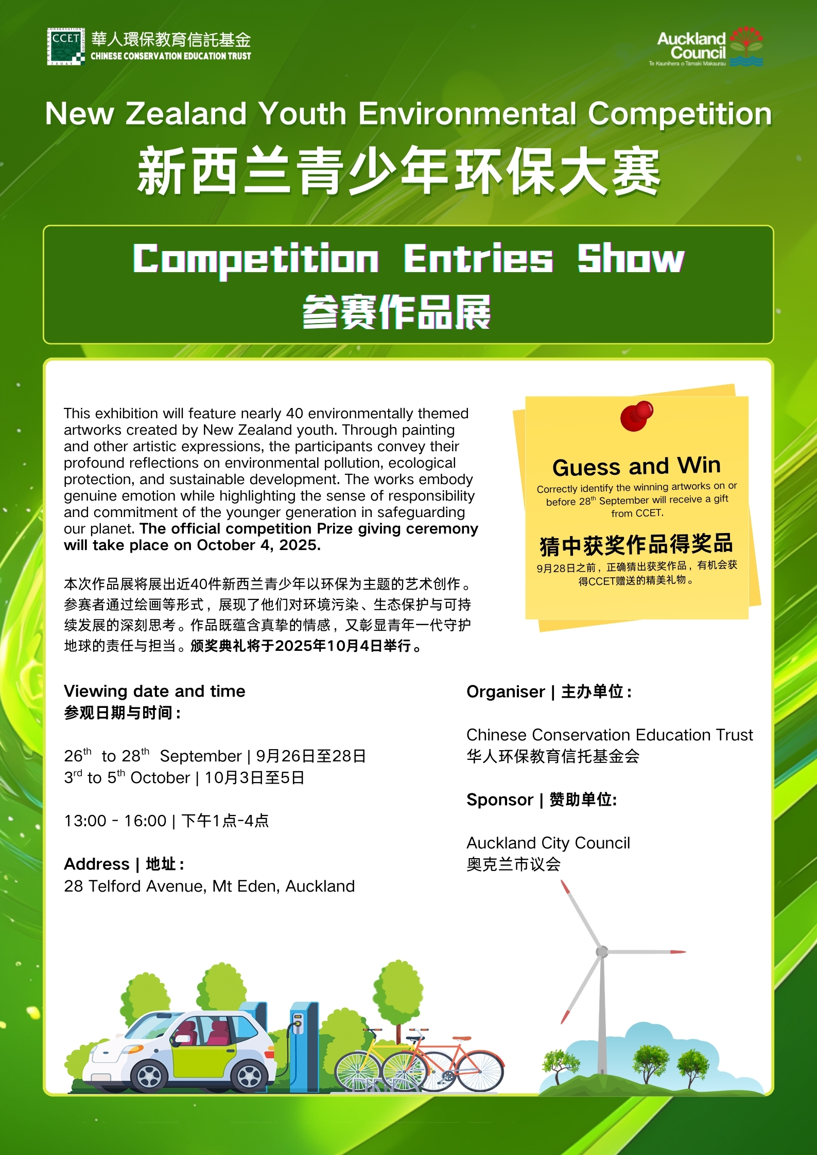 This exhibition will showcase nearly 40 artworks created by New Zealand youth, all centered on the theme of environmental protection. Through painting and other artistic forms, young participants share their reflections on pollution, ecological conservation, and sustainable development. The works are full of creativity, heartfelt emotion, and highlight the younger generation’s sense of responsibility in safeguarding our planet.